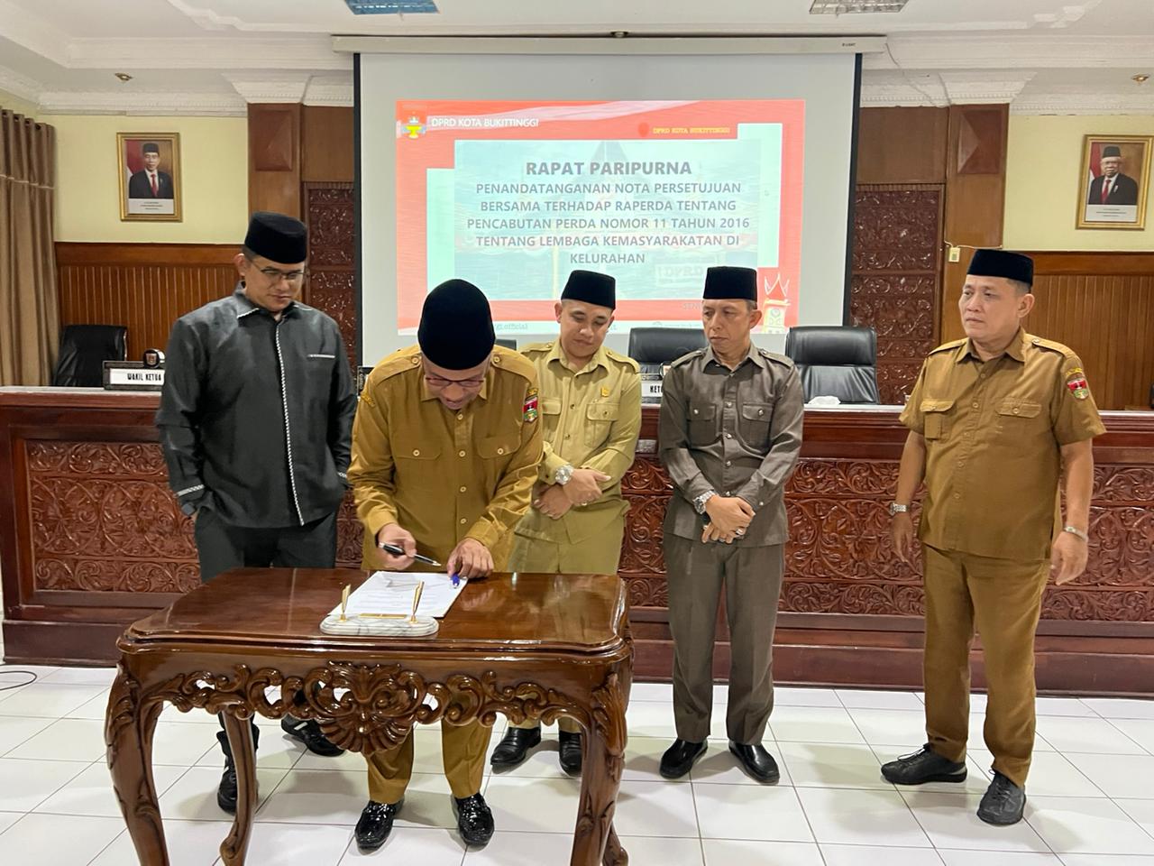 DPRD bersama Pemerintah Kota Bukittinggi, sepakati Rancangan Peraturan Daerah tentang Pencabutan Perda Nomor 11 Tahun 2016 tentang Lembaga Kemasyarakatan di Kelurahan. Pencabutan perda ini, ditandatangani dua lembaga dalam rapat paripurna, di Gedung DPRD. Senin, 22 Mei 2023