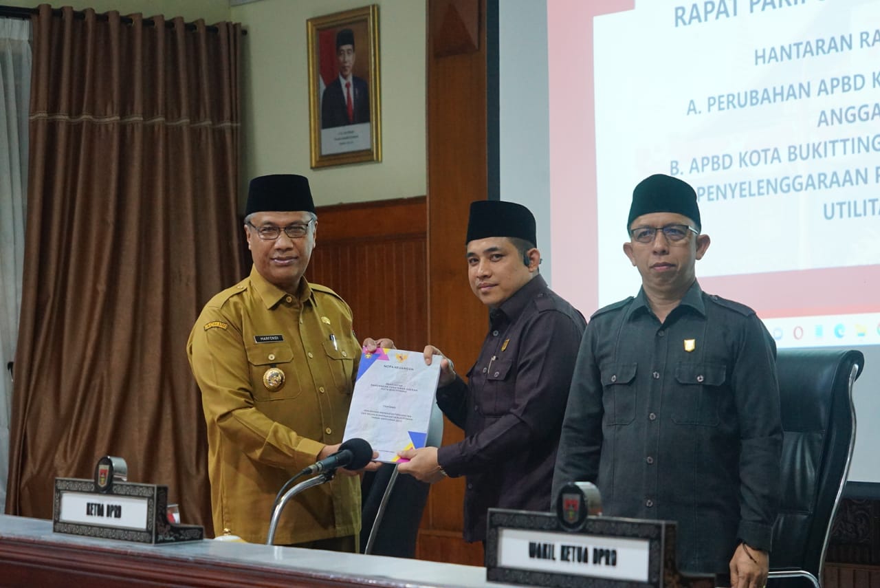 Pemerintah Kota Bukittinggi bersama DPRD Kota Bukittinggi hantarkan Raperda tentang Perubahan APBD Kota Bukittinggi Tahun Anggaran 2023, APBD Kota Bukittinggi Tahun Anggaran 2024 dan penyelengaraan Prasarana, Sarana dan Utilitas Umum. Tiga rancangan anggaran itu, dihantarkan secara resmi dalam rapat paripurna di Gedung DPRD, Kamis, 14 September 2023.