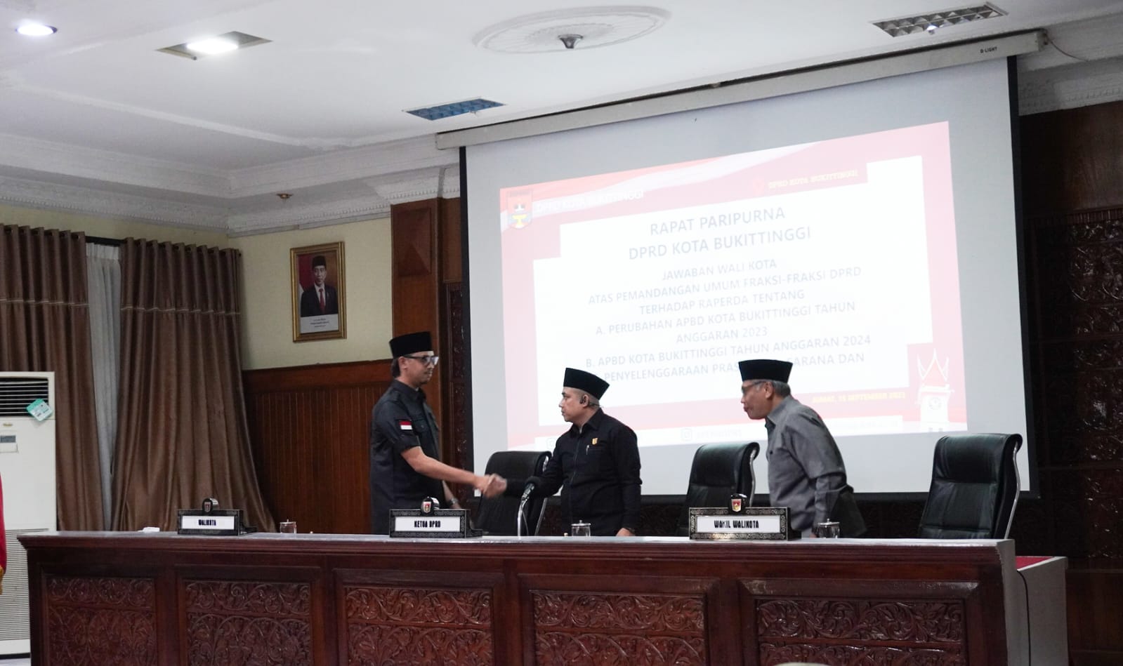Wali Kota Bukittinggi jawab pemandangan umum fraksi DPRD Bukittinggi atas R-APBD Perubahan 2023, R-APBD 2024 dan Ranperda penyelenggaraan prasarana, sarana dan utilitas umum. Jawaban itu disampaikan dalam rapat paripurna, di Gedung DPRD, Jumat, 15 September 2023.