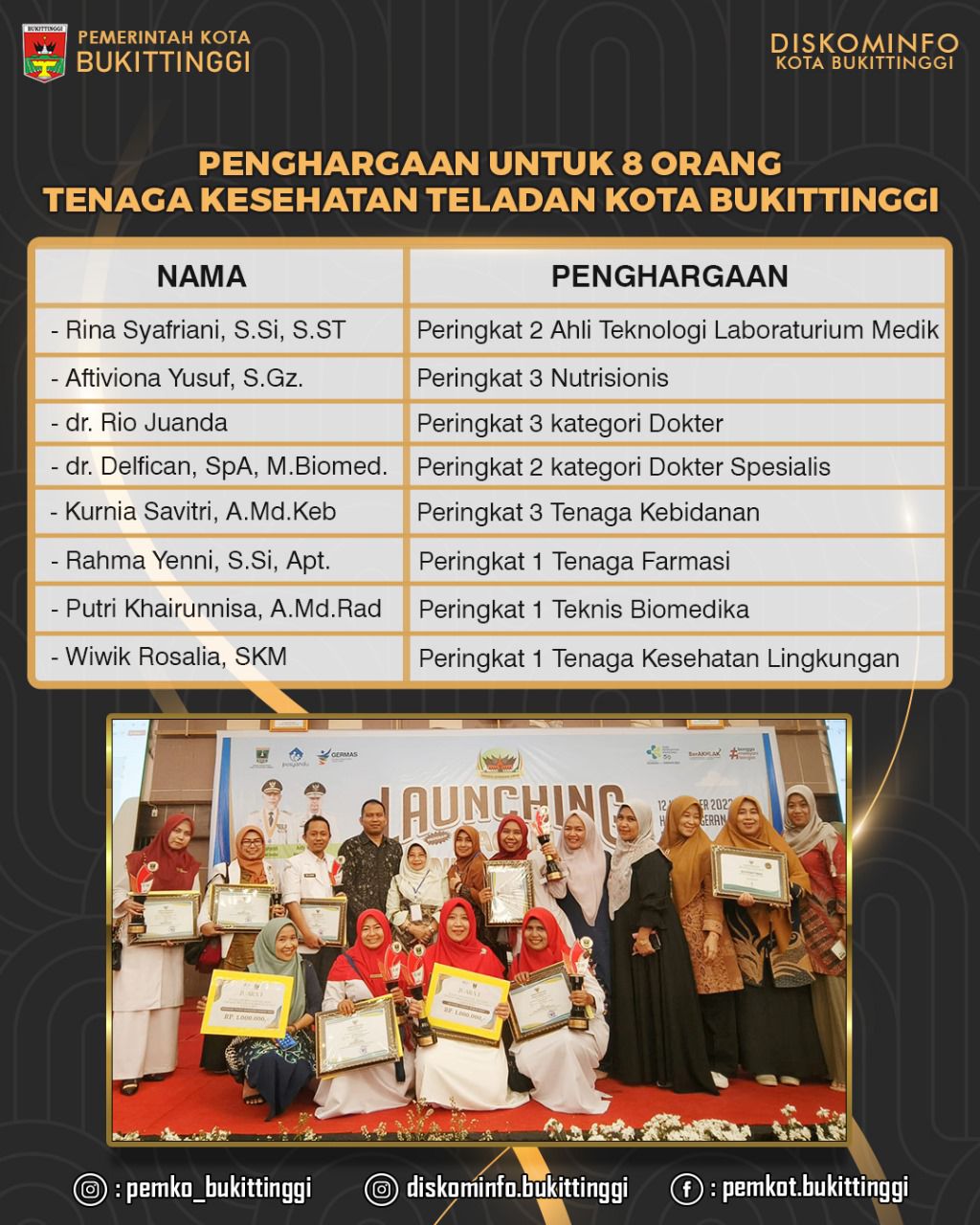 Dalam kesempatan ini juga diserahkan penghargaan untuk 8 Tenaga kesehatan teladan Kota Bukittinggi dari Puskesmas Rasima Ahmad yang mendapat peringkat kedua Ahli Teknologi Laboraturium Medik, bernama Rina Syafriani, S. Si, S. ST, dan untuk Nutrisionis mendapatkan peringkat ketiga dari Puskesmas Mandiangin Plus bernama Aftiviona Yusuf, S. Gz.