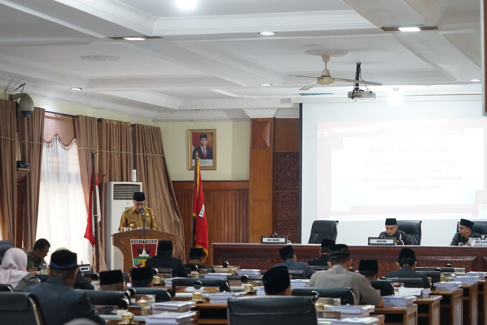 Wakil Wali Kota Bukittinggi hantarkan ranperda penanaman modal serta Pemberdayaan Perempuan dan Perlindungan Anak (PPPA) ke DPRD. Dua ranperda itu dihantarkan dalam rapat paripurna, di Gedung DPRD, Selasa, 21 November 2023.