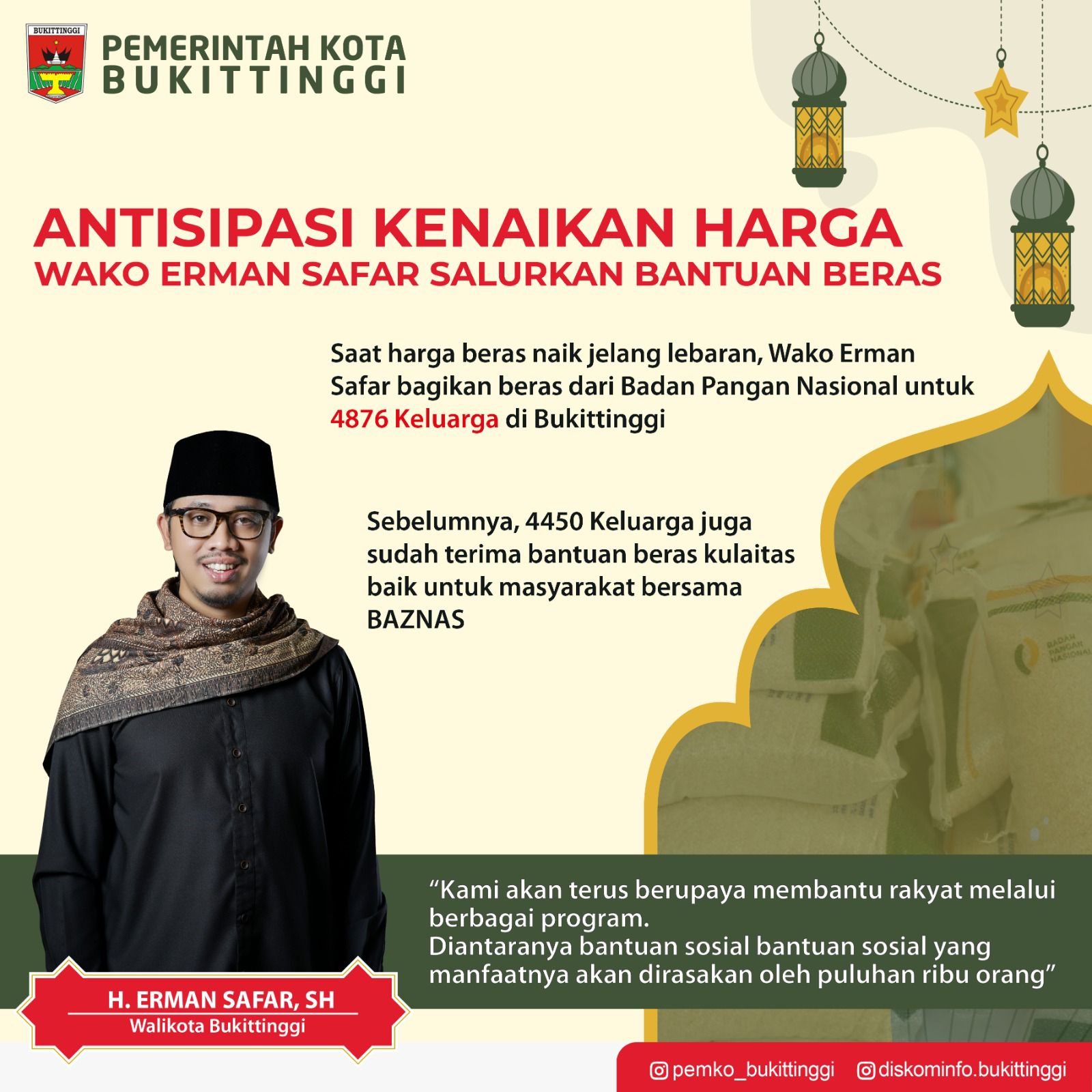 RAGAM – Saat harga beras naik jelang lebaran, Wako Erman Safar bagikan beras dari Badan Pangan Nasional untuk 4876 keluarga di Bukittinggi.