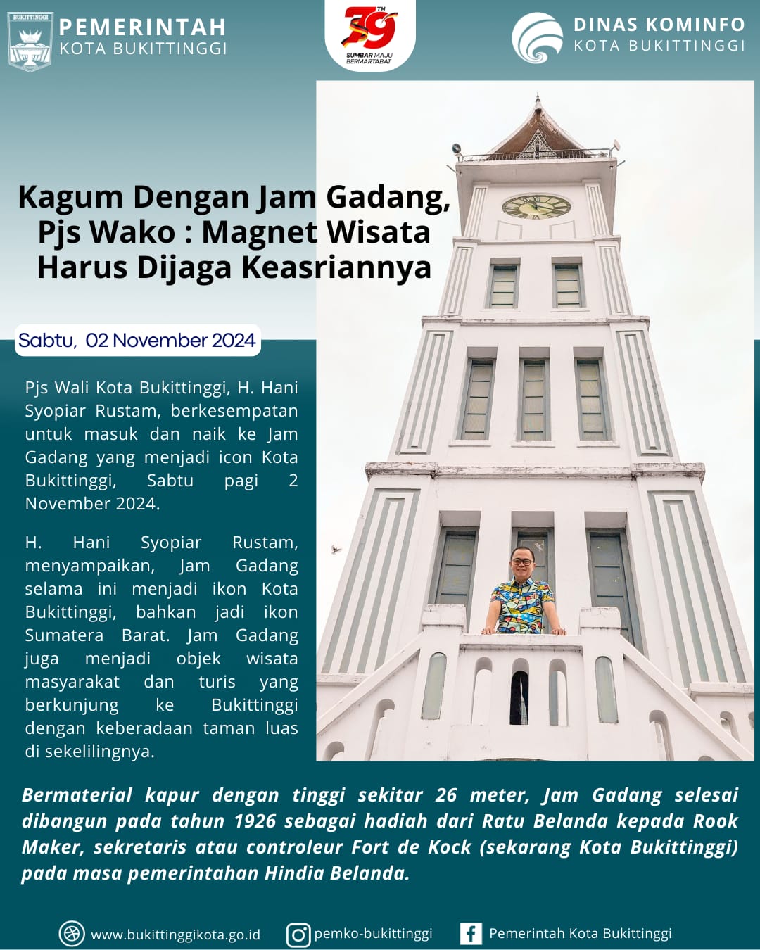 H. Hani Syopiar Rustam, menyampaikan, Jam Gadang selama ini menjadi ikon Kota Bukittinggi, bahkan jadi ikon Sumatera Barat. Jam Gadang juga menjadi objek wisata masyarakat dan turis yang berkunjung ke Bukittinggi dengan keberadaan taman luas di sekelilingnya.