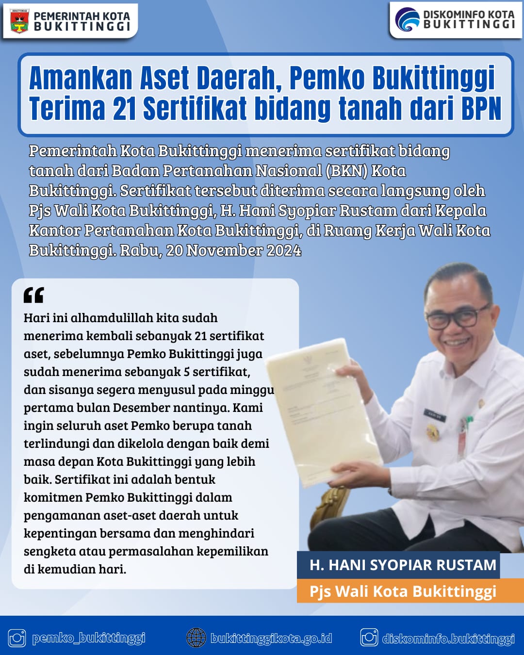 “Hari ini alhamdulillah kita sudah menerima kembali sebanyak 21 sertifikat aset, sebelumnya Pemko Bukittinggi juga sudah menerima sebanyak 5 sertifikat, dan sisanya segera menyusul pada minggu pertama bulan Desember nantinya. Kami ingin seluruh aset Pemko berupa tanah terlindungi dan dikelola dengan baik demi masa depan Kota Bukittinggi yang lebih baik. Sertifikat ini adalah bentuk komitmen Pemko Bukittinggi dalam pengamanan aset-aset daerah untuk kepentingan bersama dan menghindari sengketa atau permasalahan kepemilikan di kemudian hari,” ungkapnya.