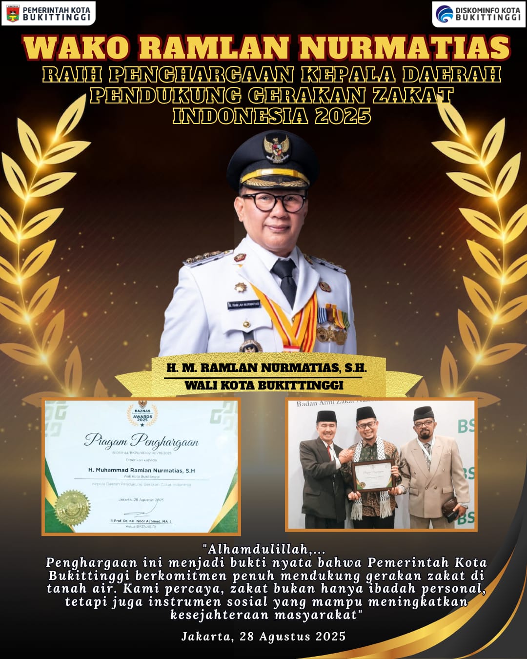 RAGAM — Wali Kota Bukittinggi, Ramlan Nurmatias raih penghargaan pada ajang BAZNAS Awards 2025 untuk kategori Kepala Daerah Pendukung Gerakan Zakat Indonesia. Penganugerahan bergengsi tingkat nasional itu digelar di Hotel Mercure Ancol, Jakarta, Kamis, 28 Agustus 2025.