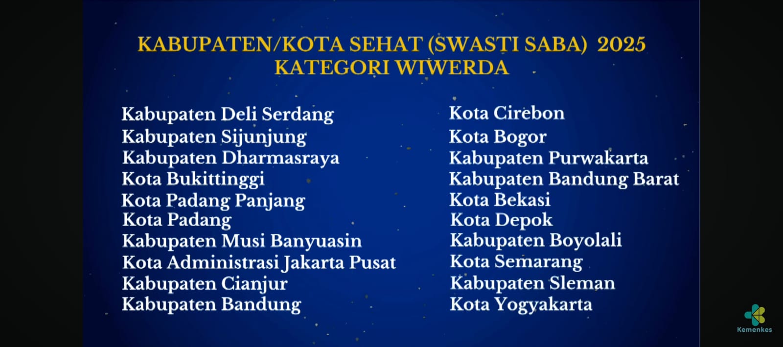 “Alhamdulillah, Swasti Saba Wiwerda kembali dapat kita raih pada tahun 2025 ini. Penghargaan ini sangat penting bagi kota yang berkomitmen mewujudkan kota sehat. Terima kasih kepada seluruh SKPD dan Forum Kota Sehat atas kerja keras dan kolaborasinya. Ini adalah hasil kerja lintas sektor. Program kesehatan bukan hanya tugas tenaga kesehatan, tetapi tanggung jawab semua pihak. Dengan penghargaan ini, kita akan terus meningkatkan upaya mewujudkan masyarakat yang lebih sehat dan lingkungan yang lebih baik,” ujarnya.